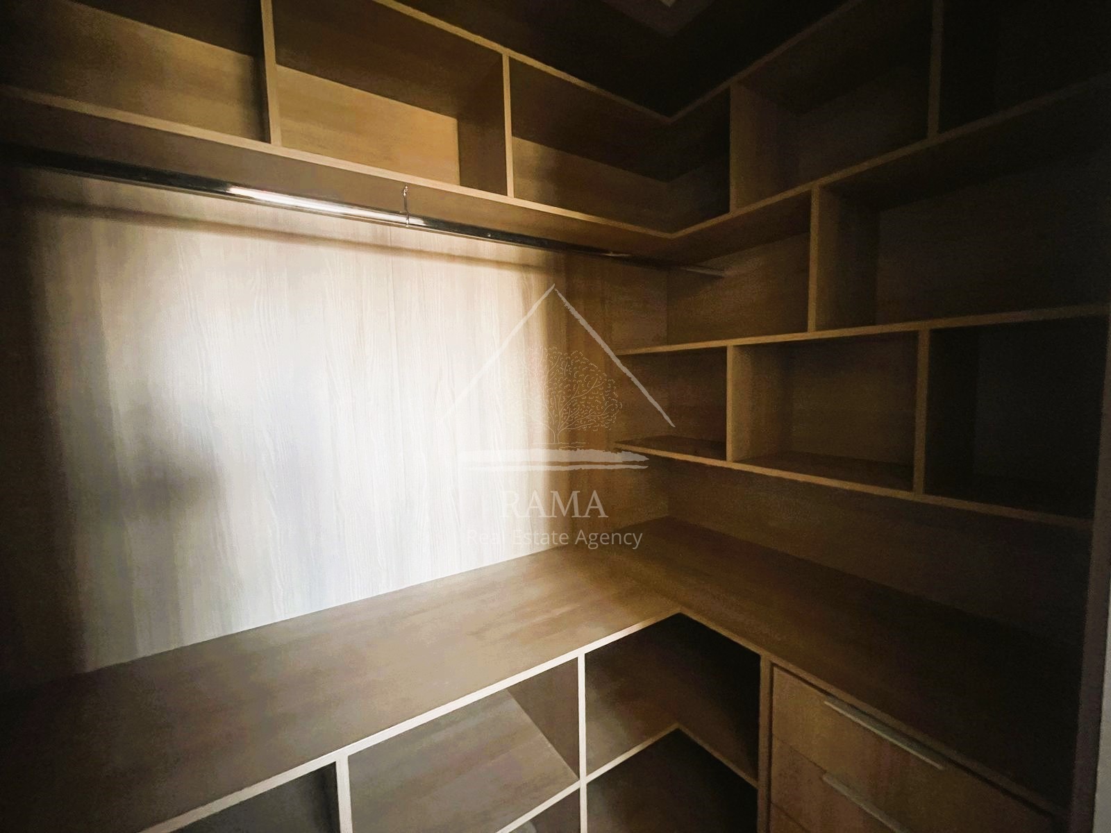 quarto com closet, armários e estantes. Ampla sala de estar e jantar com
